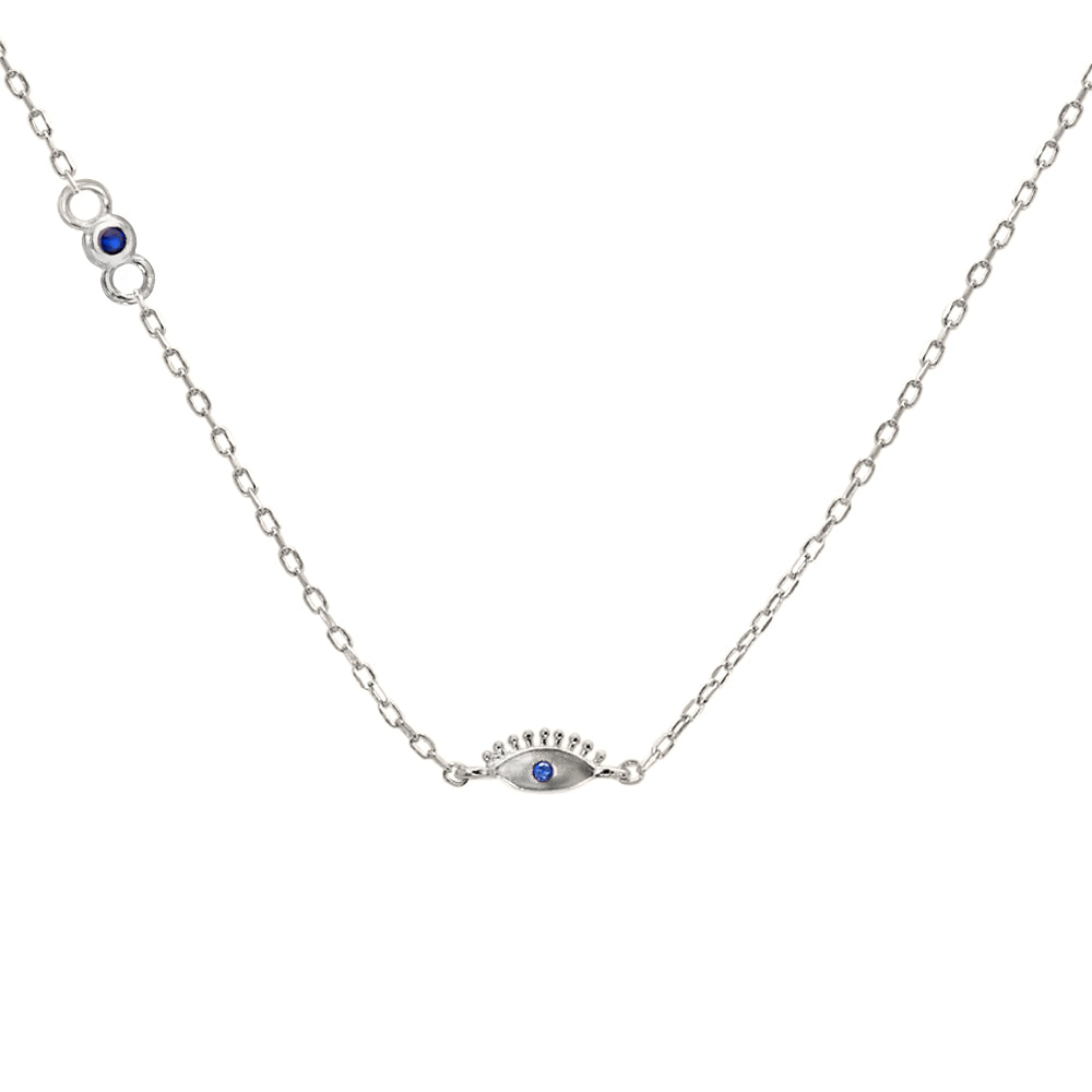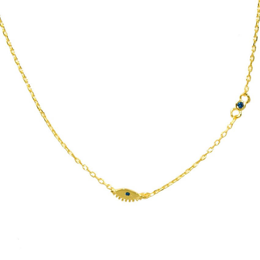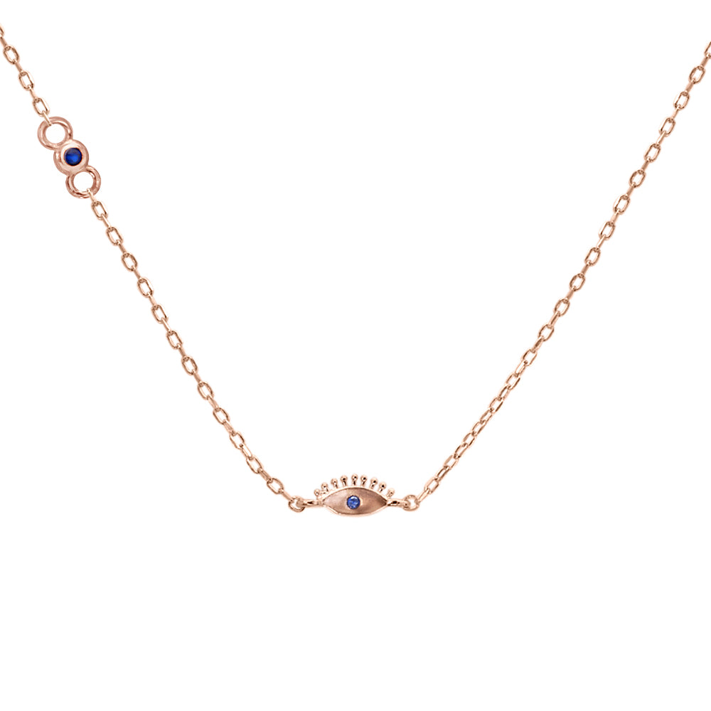Hazel Necklace is made of sterling silver 9.25 and plated with 14k gold. The necklace has a tiny evil eye as the pendant with eyelashes. The necklace comes in three colors: gold, rose gold and silver.