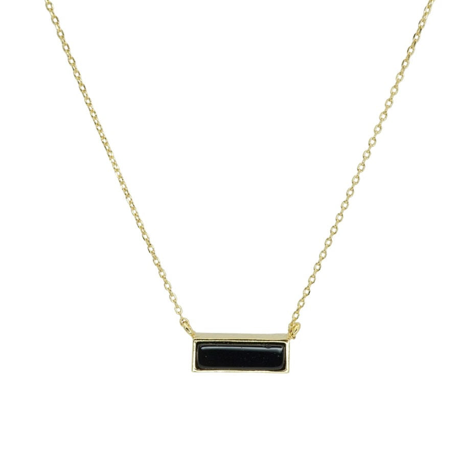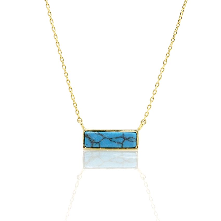 Lalya Necklace, made of Brass, has a glossy gold plating. The pendant is worn on a long chain and features turquoise and black stones in the shape of rectangles. This necklace is 16″ in length and 2″ in width.