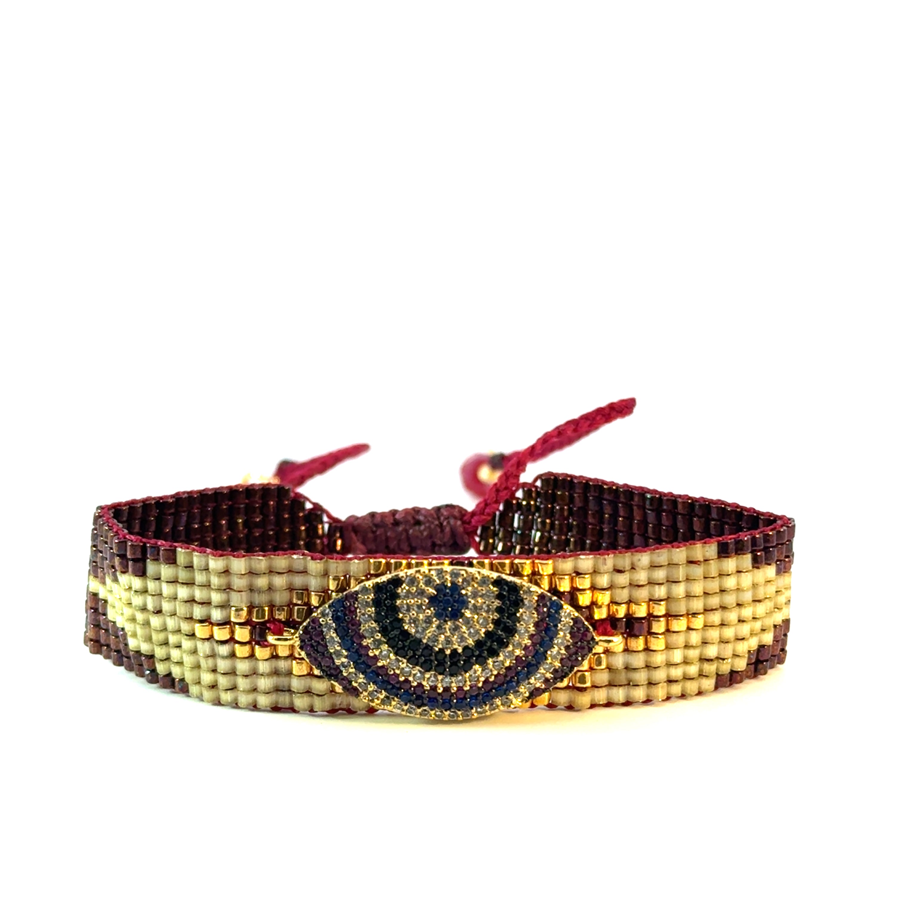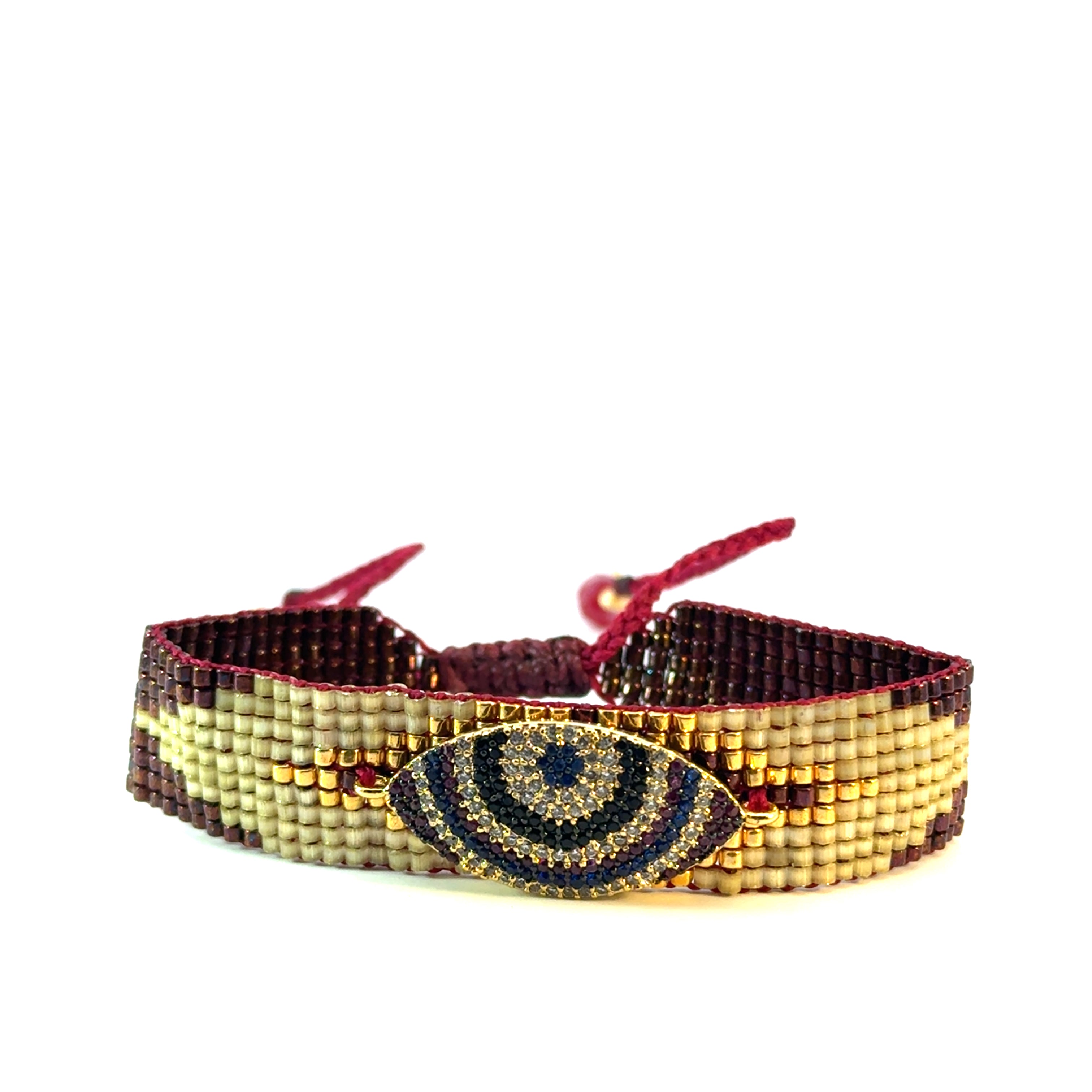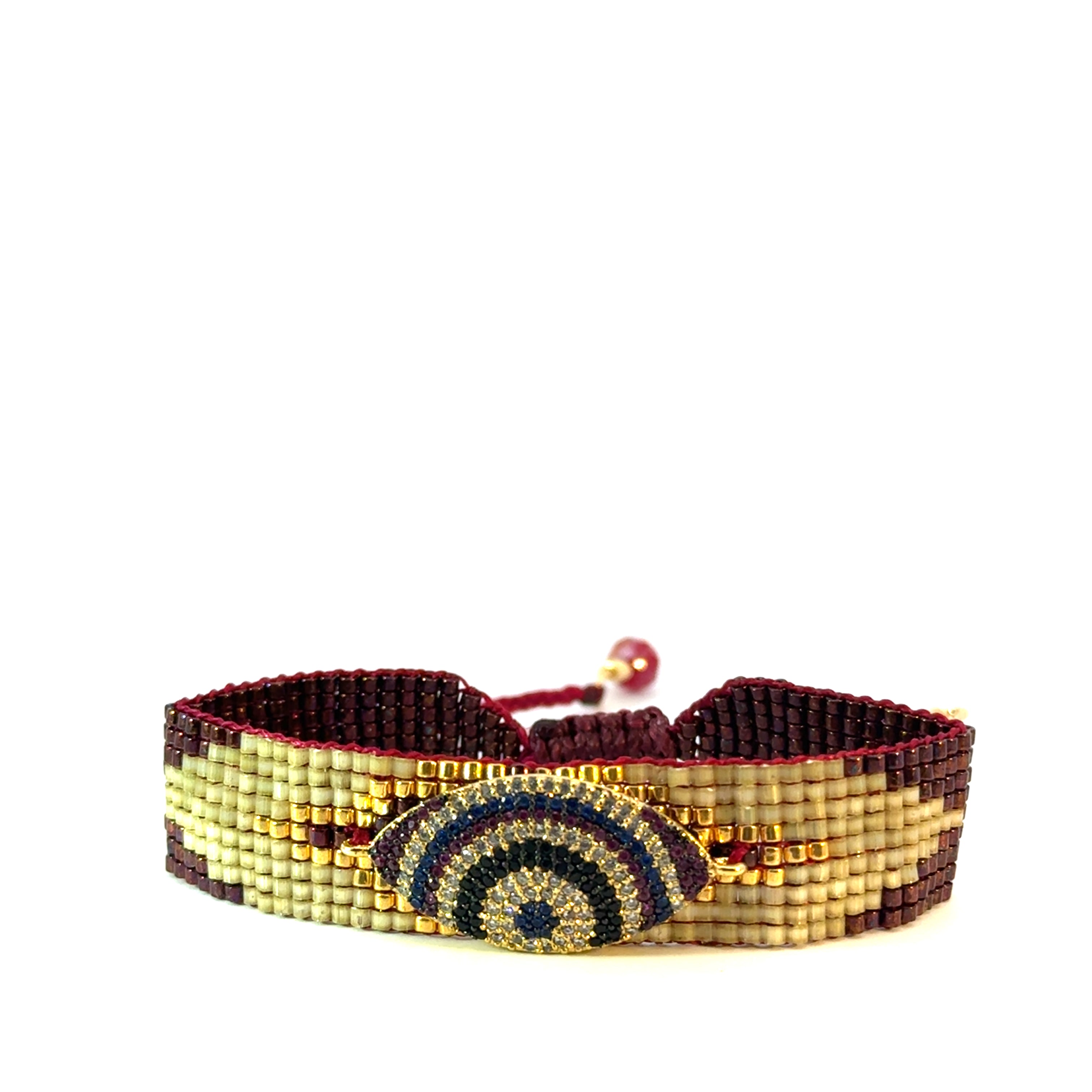 "The Eye Miyuki Burgandy Bracelet is crafted with precision using high-quality Miyuki Beads and Eye Brass. The adjustable bracelet provides a comfortable fit for all wrist sizes. Its elegant design is perfect for any occasion, making it a versatile and stylish accessory to add to your collection."