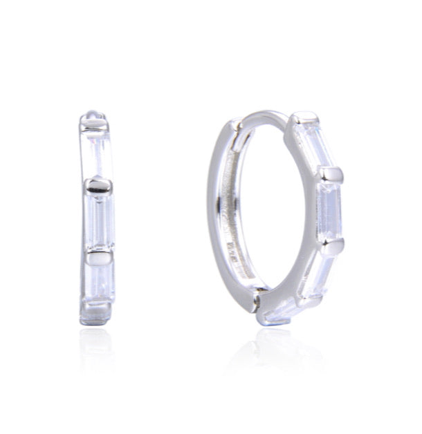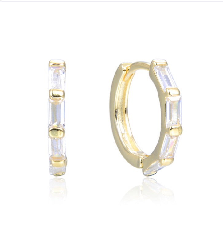 Julia baguette hoops are made with high-quality sterling silver 925 and 14-Karat gold plated. They have a shiny finish and are not heavy, which makes them perfect for everyday wear. The earrings feature four baguette-cut cubic zirconia stones. These earrings are popular with our customers for their simplicity yet elegance.