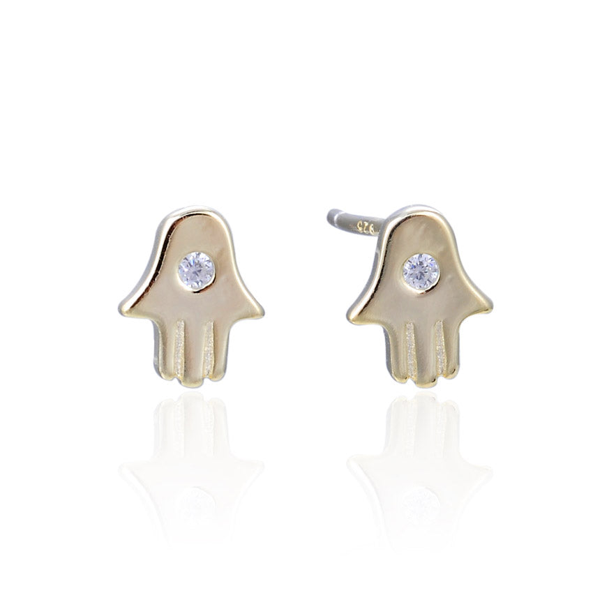 Our Aurora hamsa cubic zirconia stud earrings are made with high-quality sterling silver .925 and gold plated. These hamsa earrings are popular with our customers for their simplicity yet elegance.