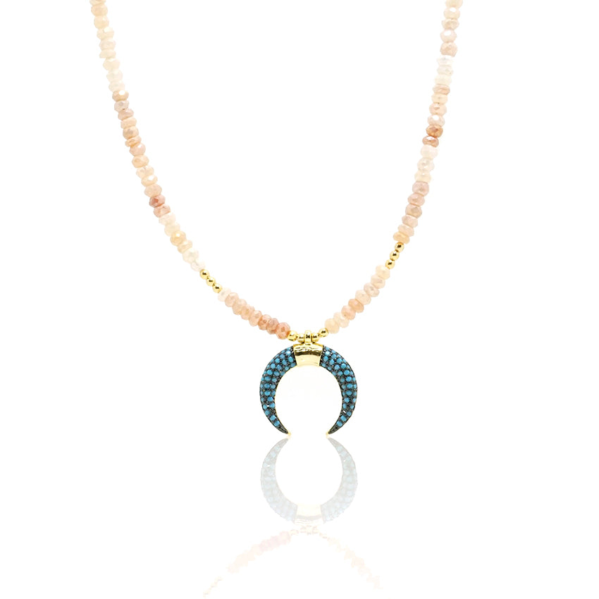 This is a beautiful choker necklace that includes a double horn pendant with turquoise and moonstone stones. The stones are natural and add a soft, feminine touch to the overall design. The sterling silver is 925 so it won't tarnish or lose its shine over time