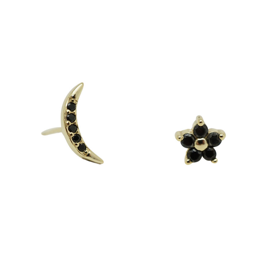 Our Ali's half moon and flower star earrings can add interest to any outfit. These earrings are available in gold and silver and clear and black cubic zirconia stones, so you're sure to find a pair that matches your style. They are perfect for all occasions, whether it is a fancy dinner or a casual day out with friends.