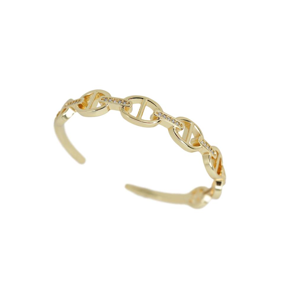 This adjustable Brass cuff is designed to fit all wrists. The shapes that make the cuff are fused with fine cubic zirconias. The plating of this cuff is made out of 14 karat gold and has a thickness of 3 microns.