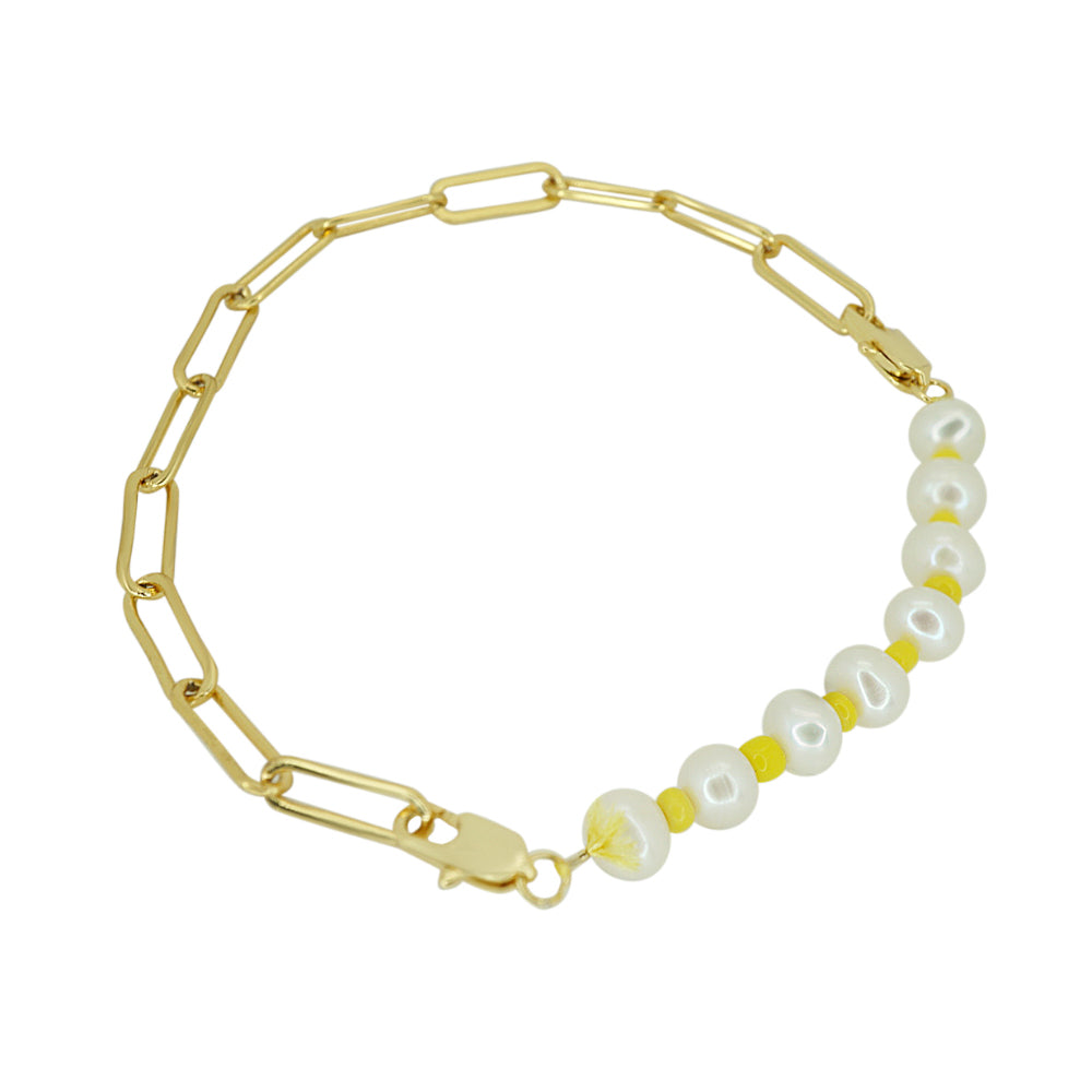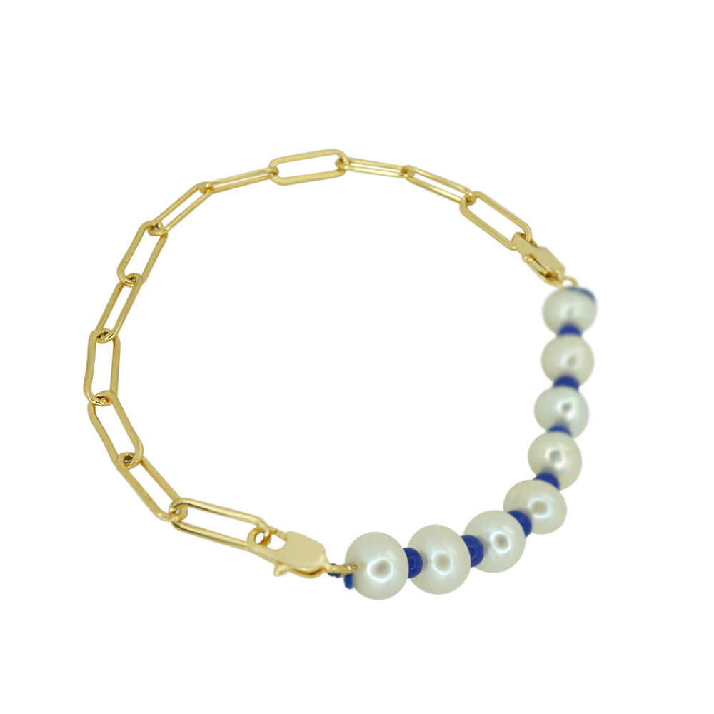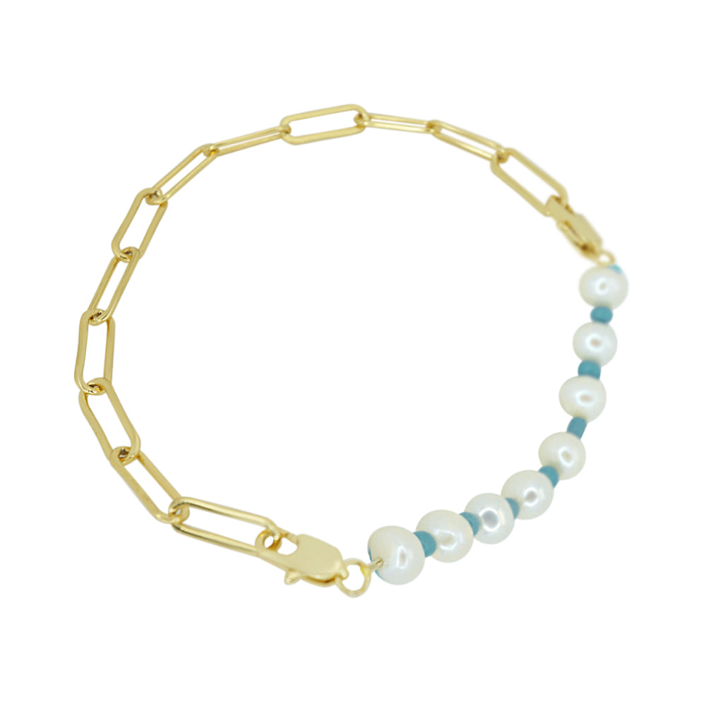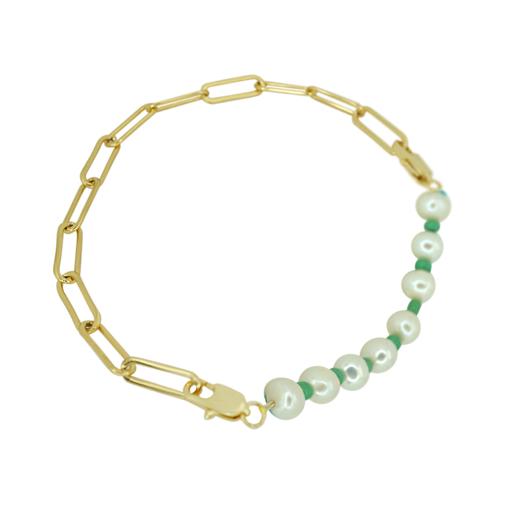 The base metal is Brass with gorgeous freshwater pearls threaded together. Measures 6" and is plated with 14-karat gold plating.