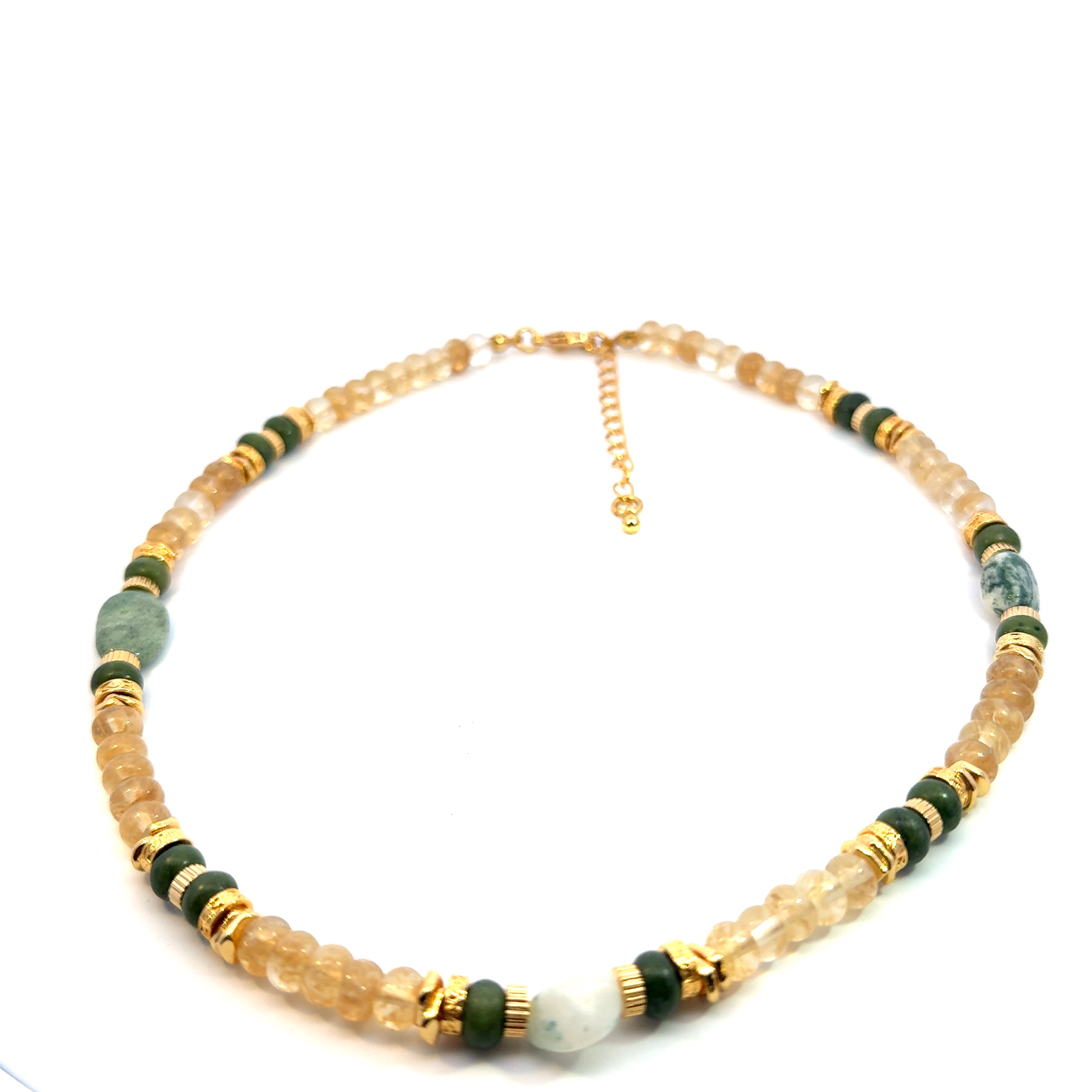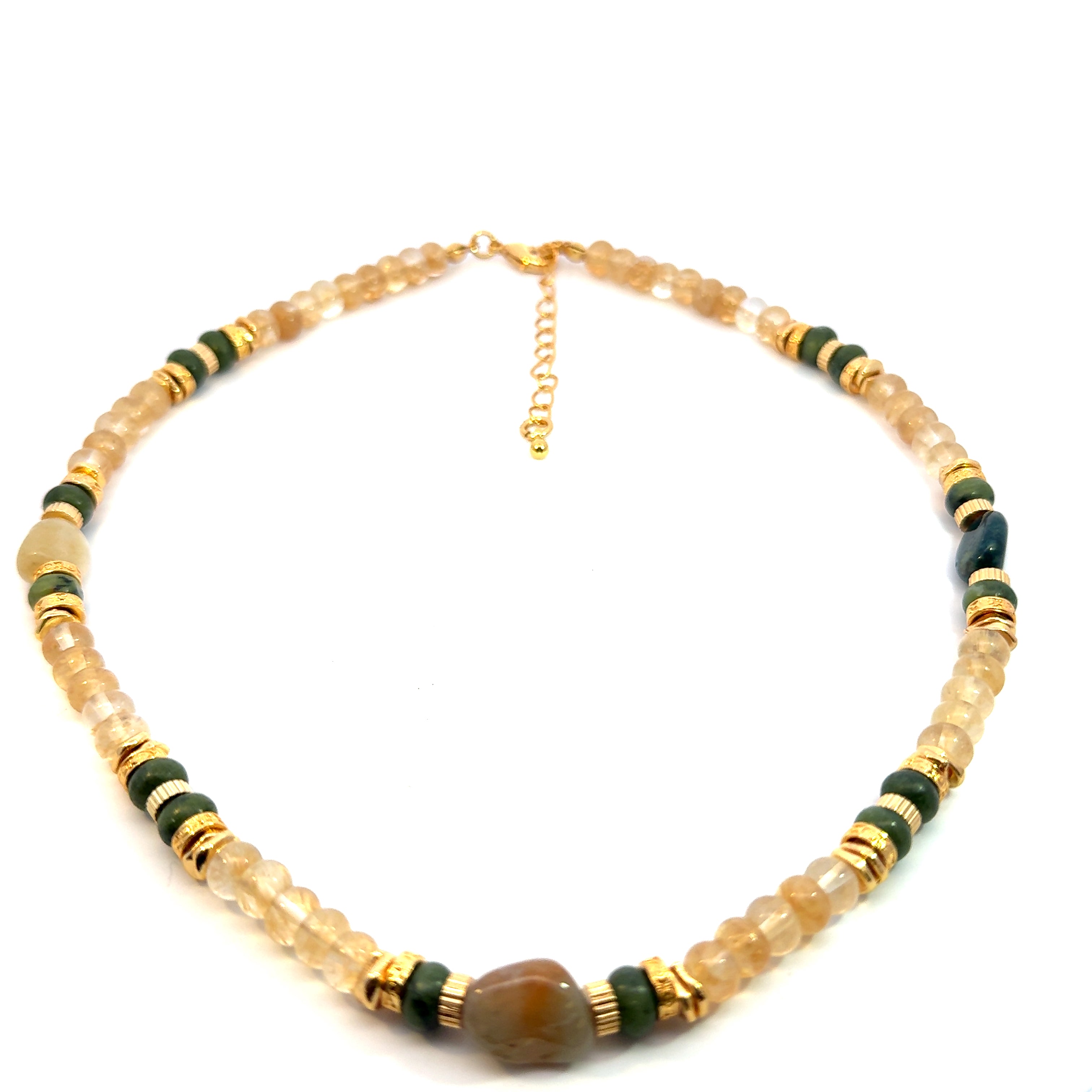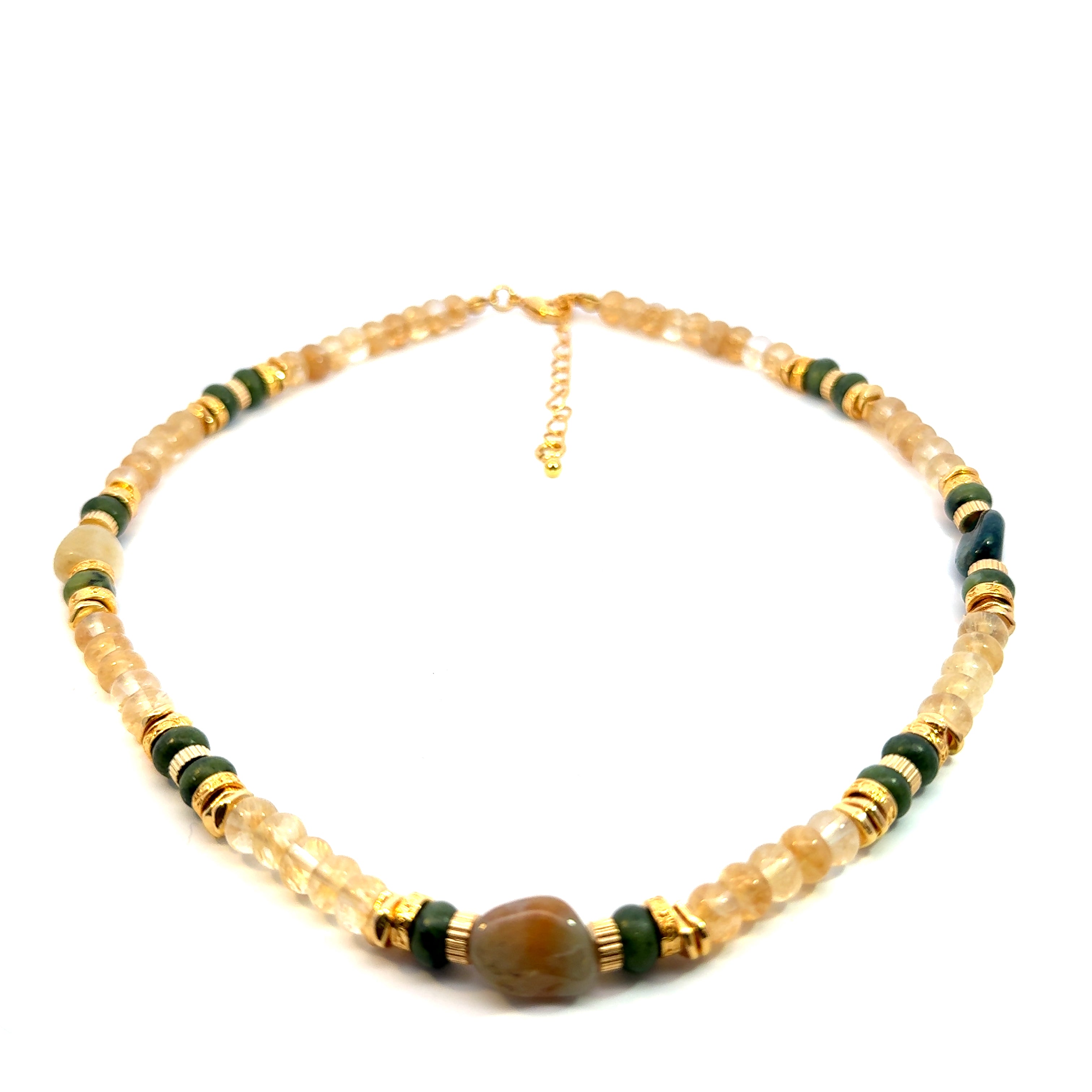 Introducing the Aurora Bead Necklace, a stunning piece of jewelry that is sure to catch the eye. This necklace is made of citrine and jade beads, which are known for their unique properties that can help with emotional balance and healing. The combination of these two stones creates a beautiful and meaningful piece of jewelry that is perfect for any occasion.
