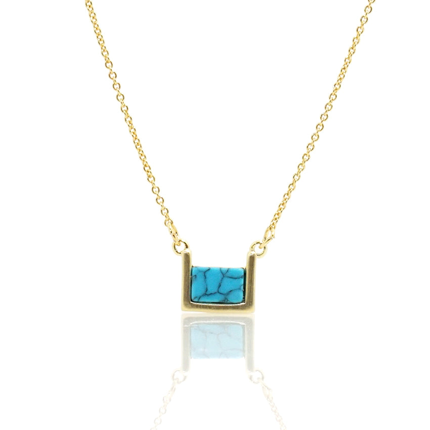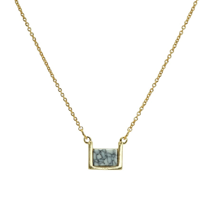 Meet the Ella Necklace. This necklace is created with brass and plated in 18k gold. The necklace is adorned with small, square stones. Stones include turquoise, black marble, and white marble. The size of this necklace is 16 inches in length.