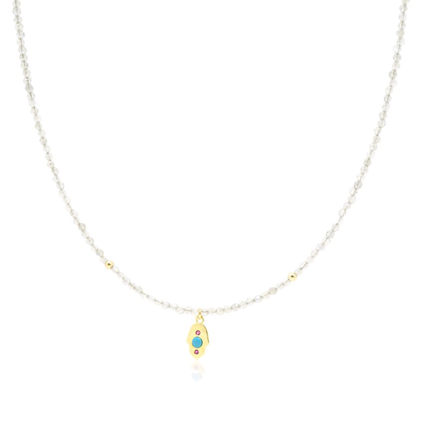 The Cadie Necklace is a great addition to any jewelry collection. This 14k gold plated necklace features a hamsa style pendant with a beautiful Labradorite stone for a touch of glamour. It is the perfect accessory for all your outfits.