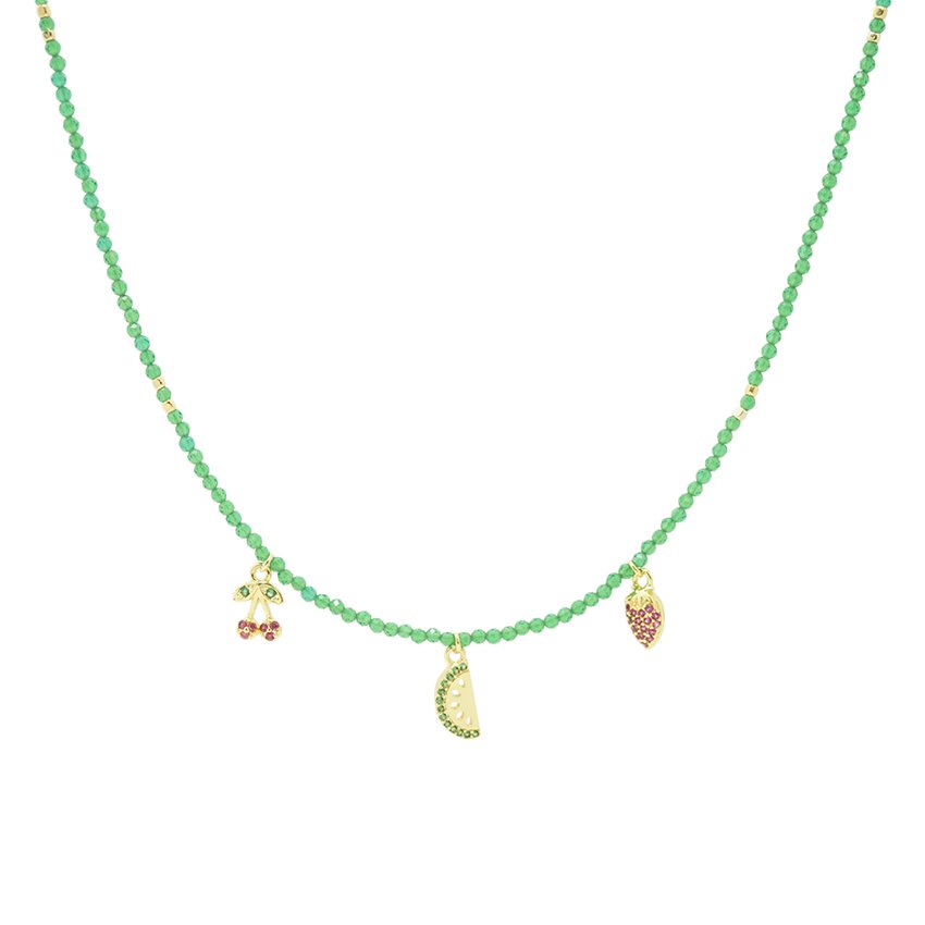 Caritta Necklace is a fashion jewelry for women. It is made of Stainless Steel with 14K gold plated to create this beautiful piece. The designer is inspired by the fruit basket, and created this triple fruity design cubic zirconia necklace that weaves in and out of layers of metal to create the illusion of a fruit basket.