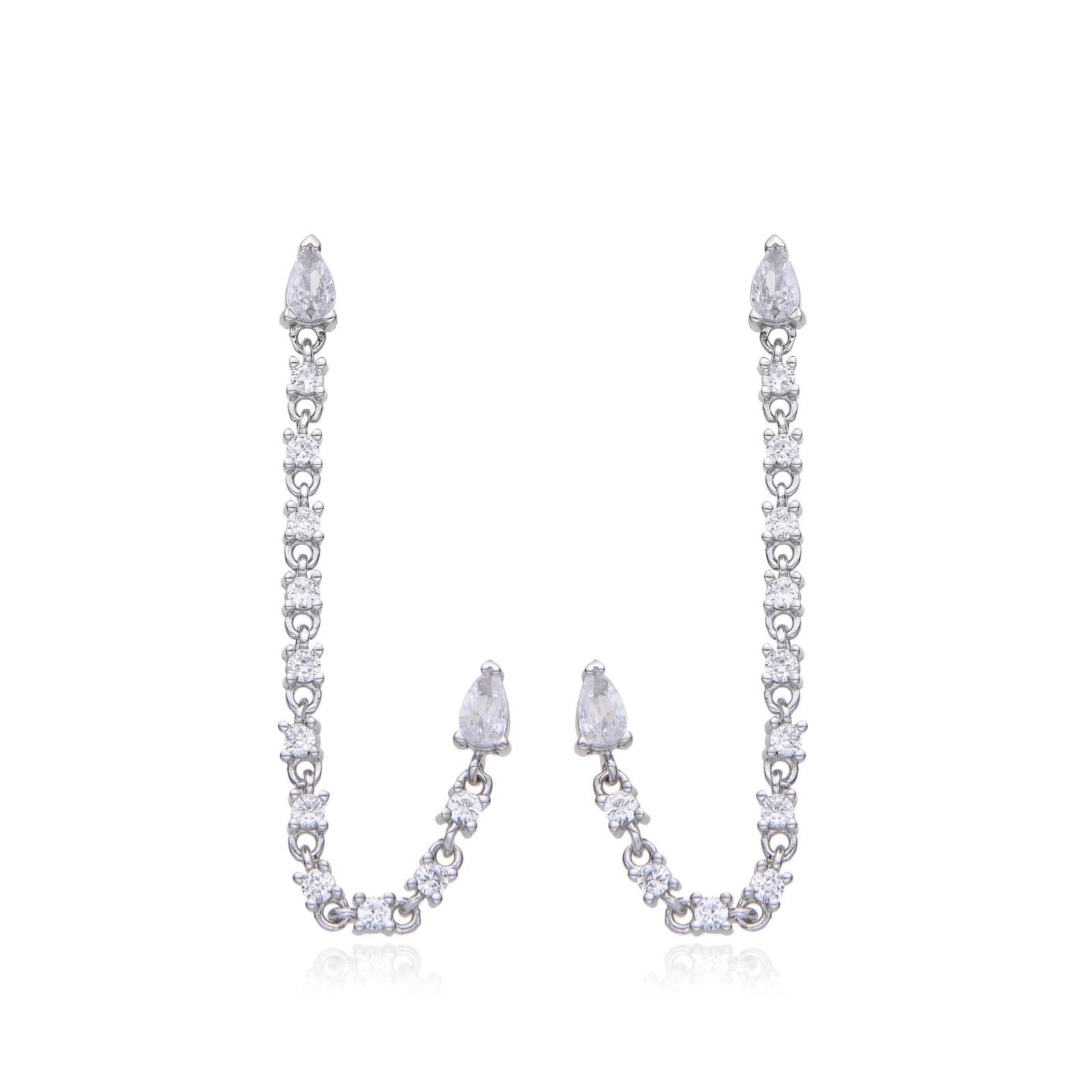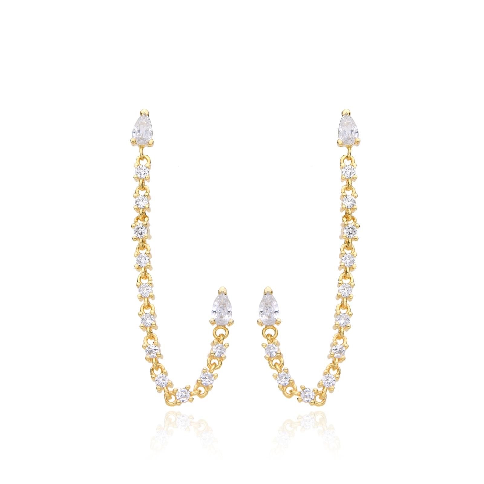 Crafted from high-quality Sterling Silver 925 and hand-finished with a 14K Gold plating, our Jill Chain earrings feature two studs connected by a sparkling CZ chain.