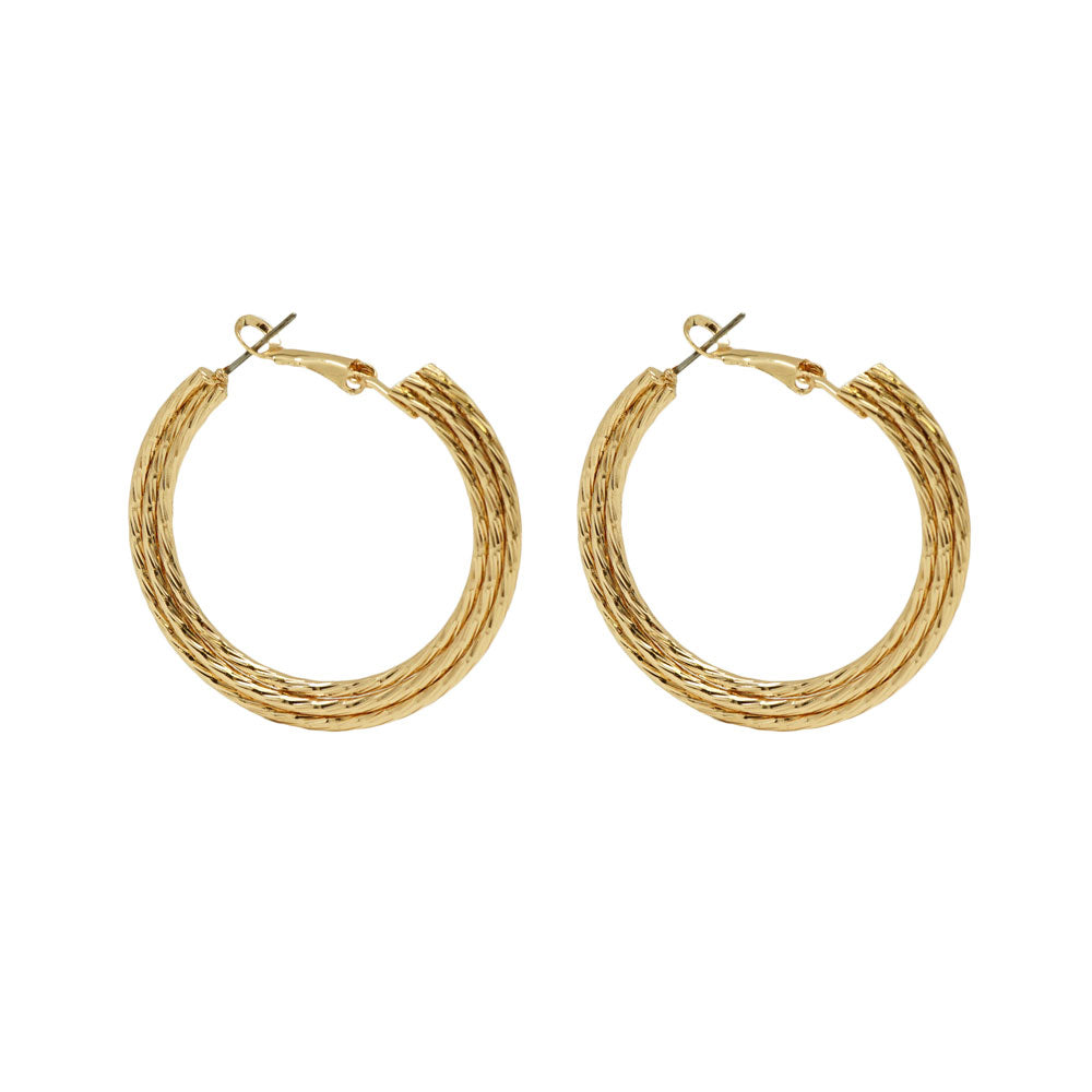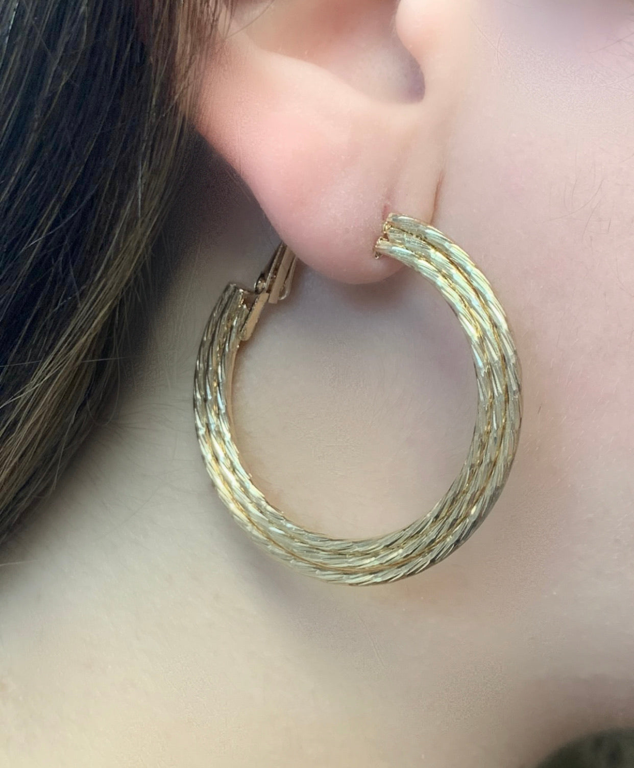 These brass hoop earrings are great for every day wear. They are about 1 inch in diameter and are supremely light weight.