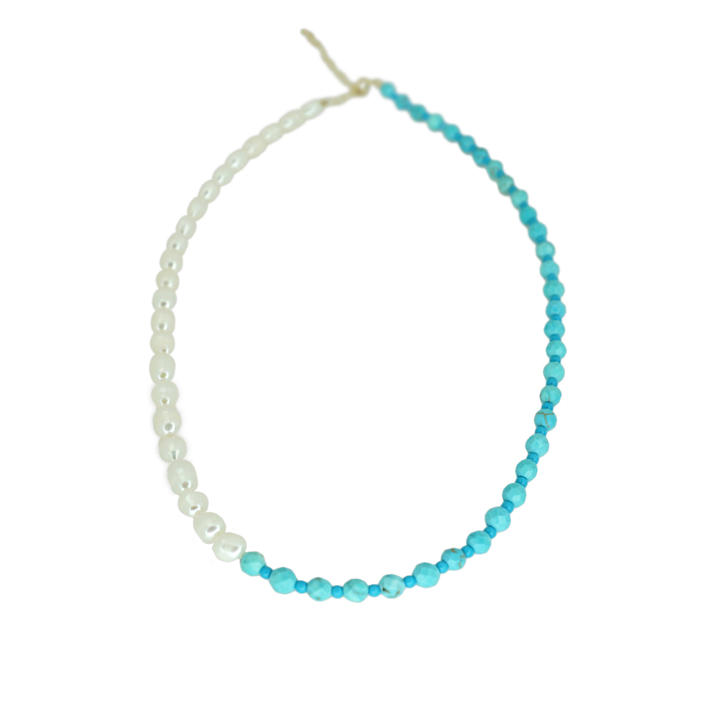 This charming necklace is made with white freshwater pearls and turquoise stones. This elegant choker can be worn alone or layered with our other designs for a hot summer look!