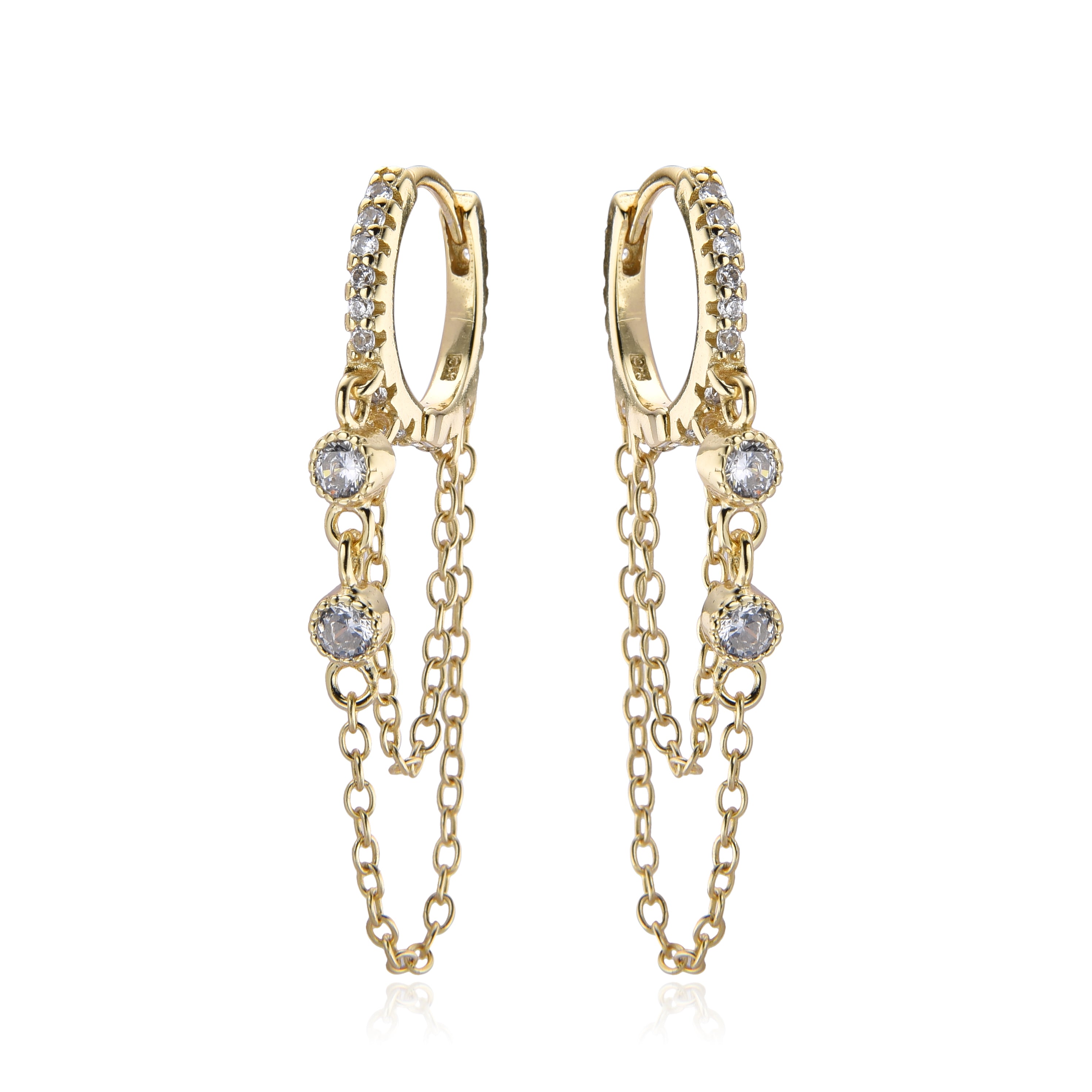 These clear pave huggies are tethered by a clear-spotted chain. Our material is Sterling Silver 925, Gold plated 14K