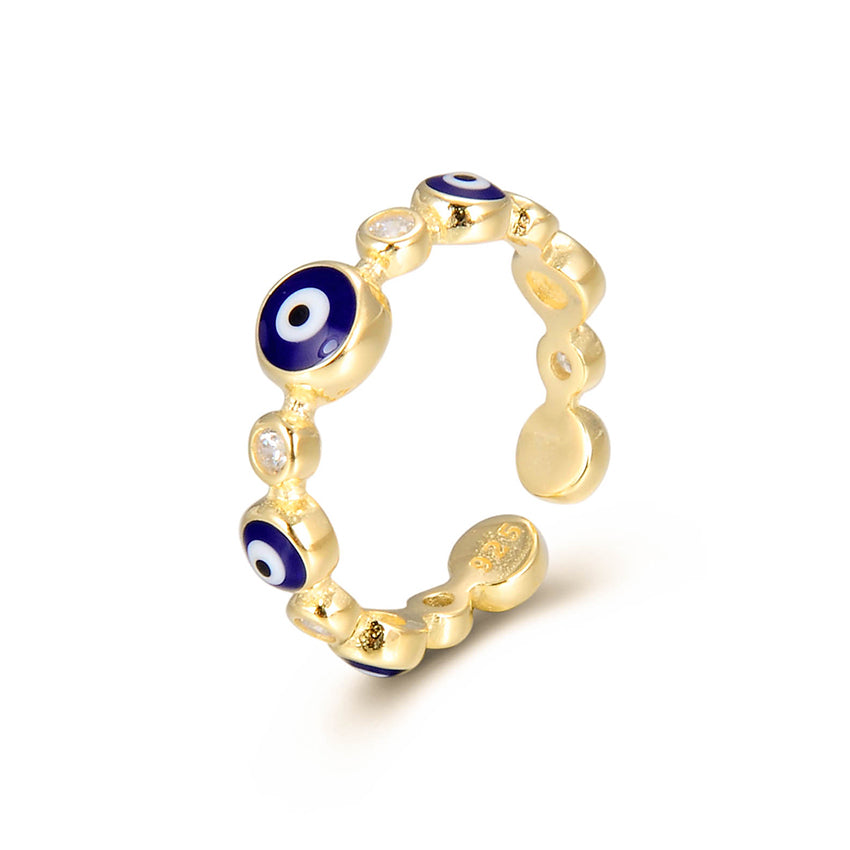 Introducing the Annabella round evil eye ring, a beautiful and adjustable piece of jewelry that can be added to your collection. This ring is made of high-quality sterling silver 925 and 14-karat gold plated, ensuring durability and resistance to tarnishing. The ring features round evil eyes and clear cubic zirconia stones around, adding a unique and eye-catching design to the ring.