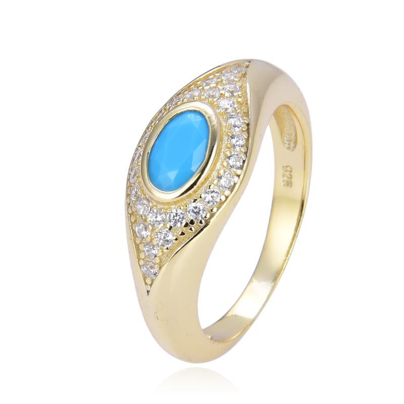 The ring features Cubic Zirconia stones that are known for their brilliance and clarity, making them a good choice for jewelry. The available colors for the stones are Clear, Turquoise, and Blue, which add a pop of color to the ring and make it more eye-catching. The style of the ring is Cubic Zirconia Evil Eye Ring, which is a trendy and fashionable choice for jewelry.