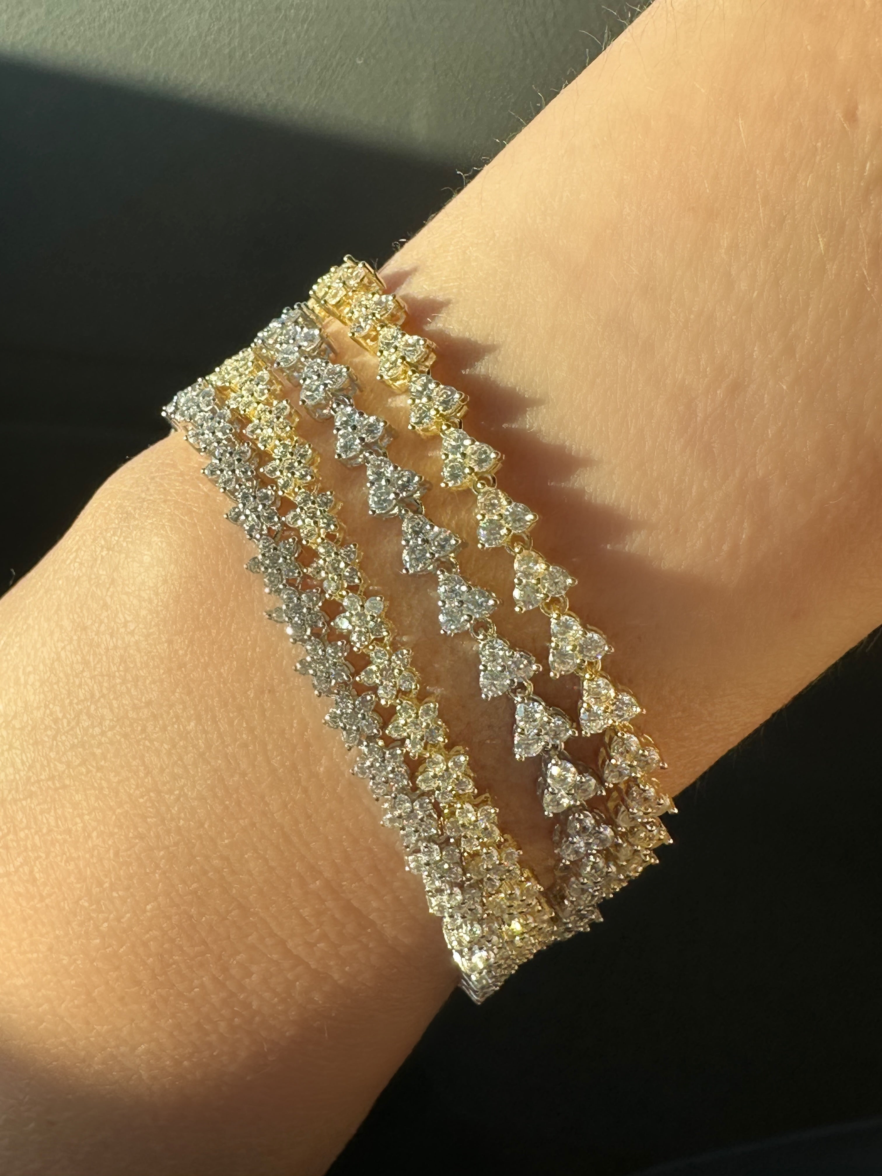 Overall, our Arrow and mini flowers bracelets are a beautiful and elegant accessory that is perfect for adding a touch of sophistication to any outfit. The combination of Sterling silver 925, Gold plated 14K, and Clear Cz material makes these bracelets a unique and eye-catching piece of jewelry that is sure to turn heads. Whether you're dressing up for a special occasion or adding a touch of glamour to your everyday look, these bracelets are the perfect choice.