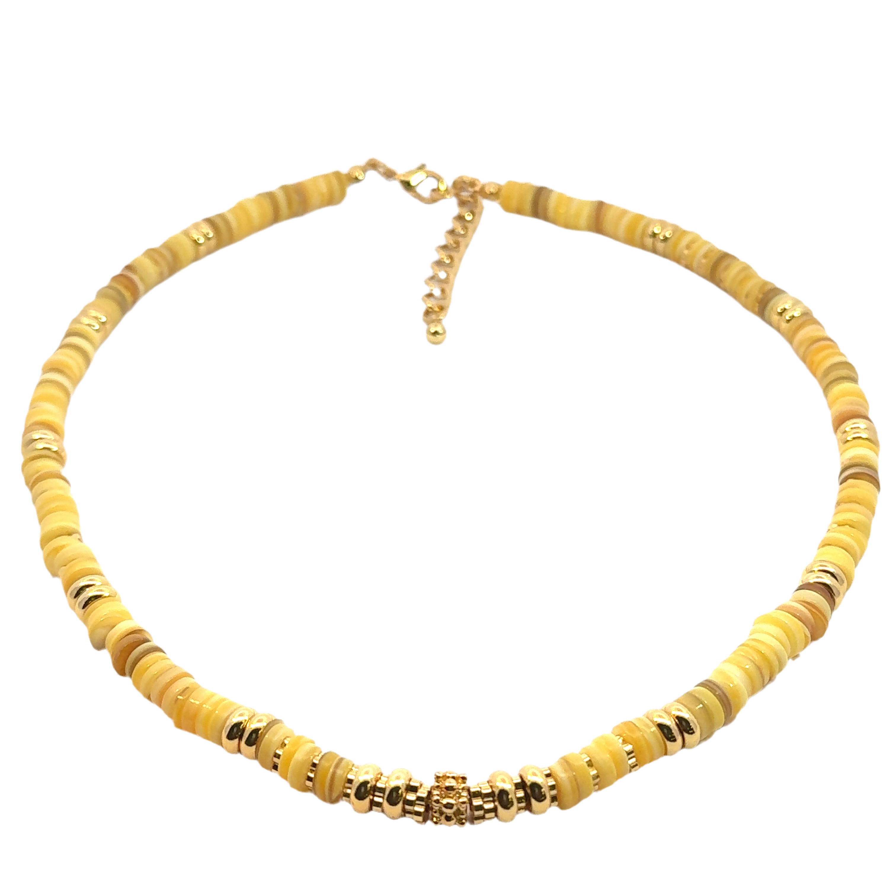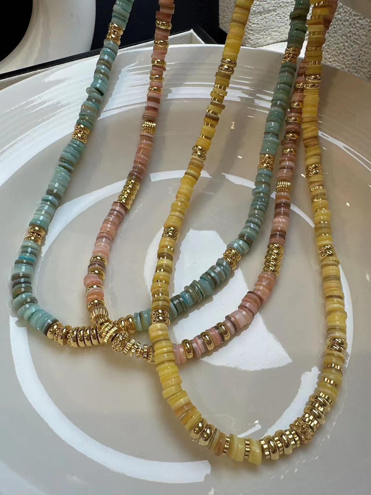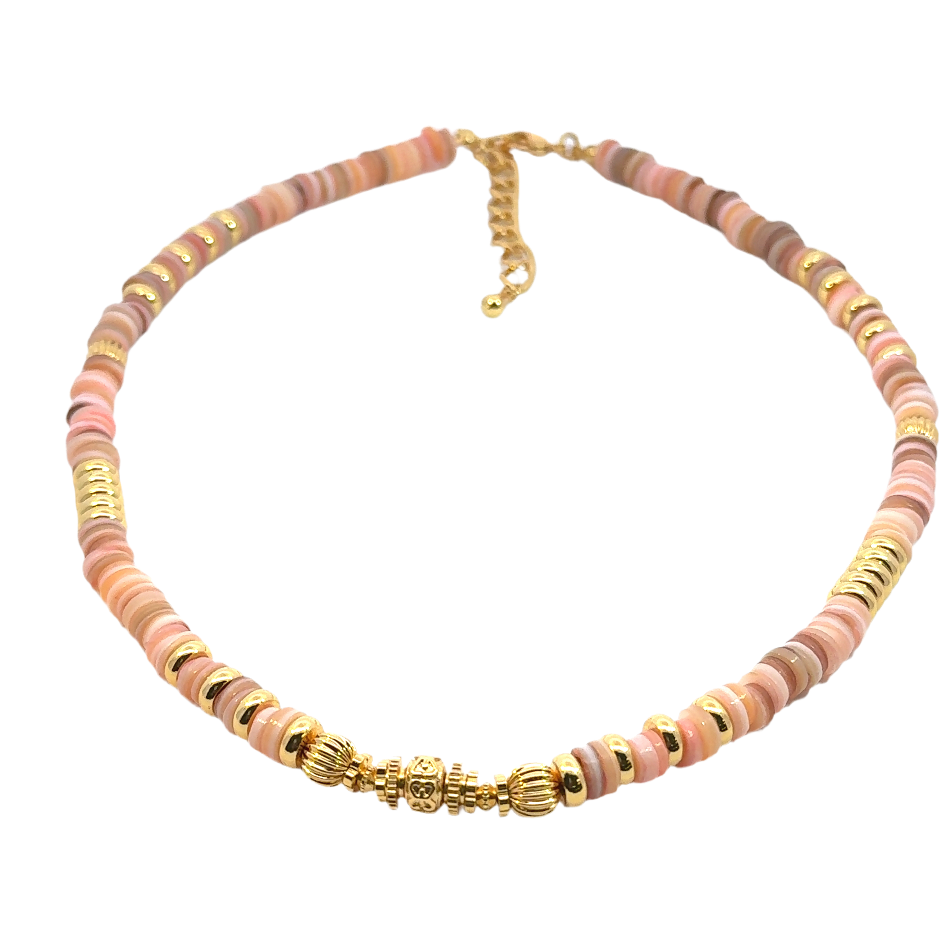 Our Shelby Necklace is made of real shell beads and brass gold plated pieces, Handmade in USA