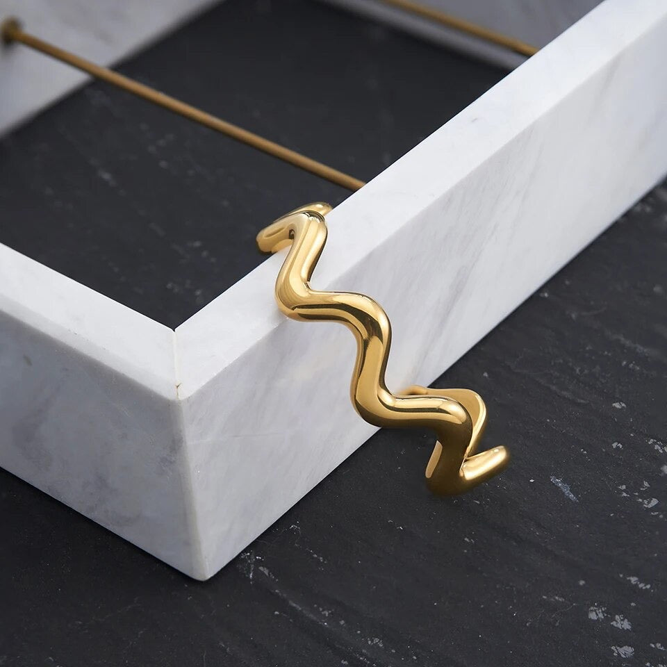 Introducing our Zig Zag Open cuff Bracelet, a must-have form the modern woman who exudes elegance, adding a golden glow to your wrist. And layer it up. These bracelets were made for it.