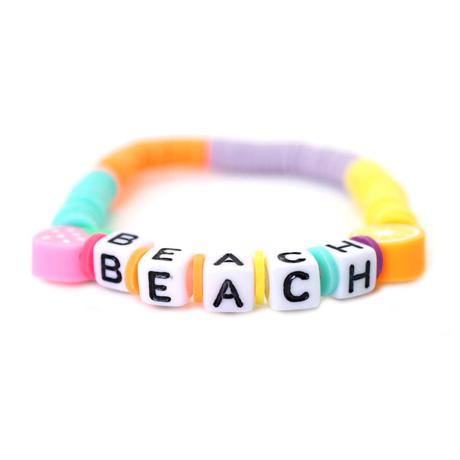 Vinyl disc bracelet with fruit charms and the word "Beach"